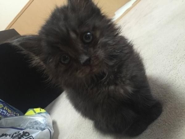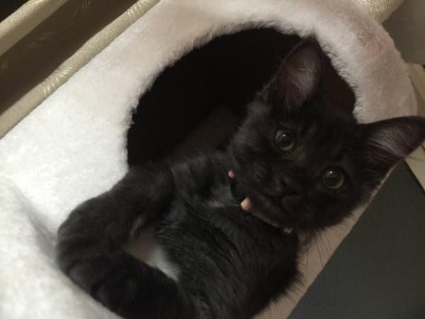 В дождливый майский день двое людей заметили на обочине дороги мокрого и грязного черного котенка. По словам его спасителей, если бы они его не подобрали, он мог и не пережить дождь. Они обтерли его от грязи и котенок тут же сладко заснул.