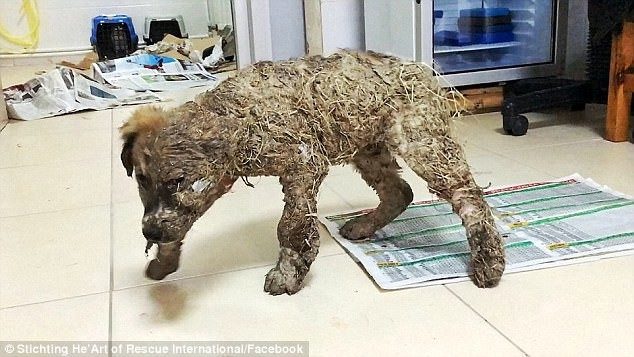 Дети измазали этого четырехмесячного щенка промышленным клеем. Засохший клей, словно цемент, прилип к коже животного и стеснял движения.