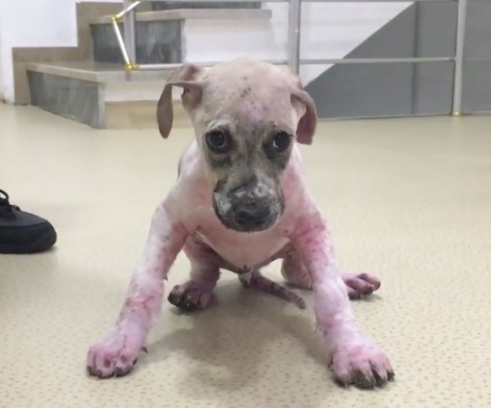 Густая смесь клея и мусора превратилась в твердую корку, к некоторым участкам тела затруднился приток крови. К тому же, у щенка обнаружили опасный вирус, и он оглох на одно ухо — вероятно, от проникшего внутрь клея.