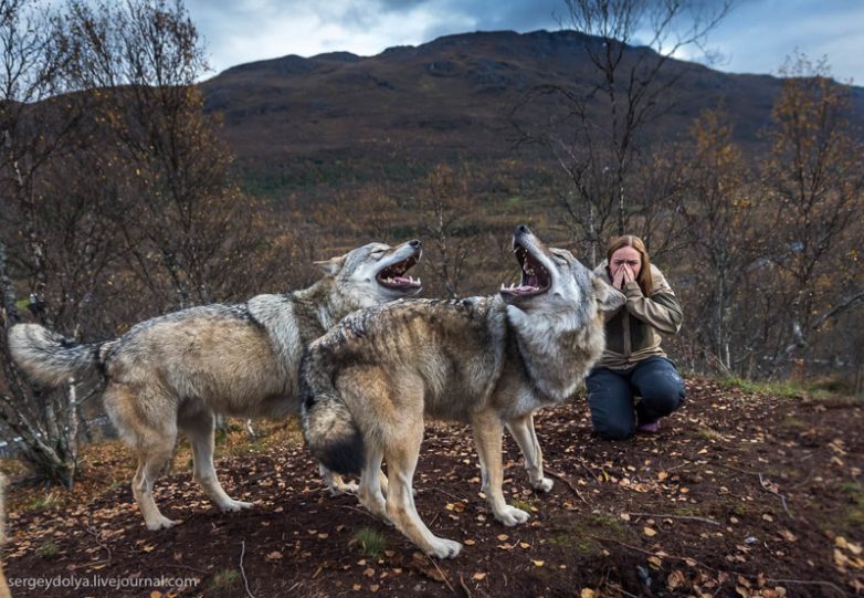 Настя сначала боялась, потом привыкла и начала делать селфи с хищниками. Волки подыгрывали…