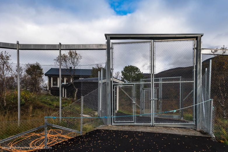 Вольер волчьей стаи напоминает фильм «Парк Юрского периода» — такая же высоченная ограда в два ряда. Размер тоже немаленький, как пять футбольных полей. Честно говоря, поначалу заходить довольно боязно, особенно, если заметить, что волки уже поджидают…