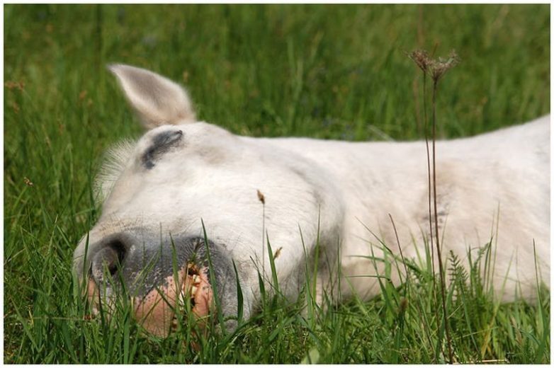 Когда люди спят, они, бывает, видят сны. Вероятно, у лошадей происходит то же самое. Если понаблюдать, через закрытые веки этих животных заметно движение глаз вверх-вниз, да и ногами лошади во сне тоже двигают, словно бегут рысью. От маленьких детей приходилось слышать вопрос о том, болит ли у лошадей голова, но кто без сомнения для себя самого на него ответит? И о том, видят ли лошади сны, можно лишь делать предположения. Наверное, видят. Не зря ведь люди создали даже поэтический образ спящей лошади — образ светлого, недосягаемого и прекрасного. Когда вспоминаешь о нем, сразу приходит на память загадочная белая лошадь из мультика \»Ёжик в тумане\», который и заканчивается вопросом: \»Как же там лошадь?\».