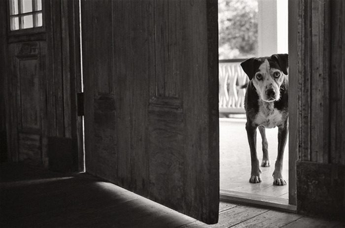 14-летний пес заглядывает в дверь с надеждой найти желающих поиграть с ним.