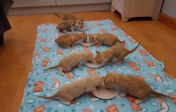 На этом фото у 5-недельных мурчалок происходит плановая заправка кашей: