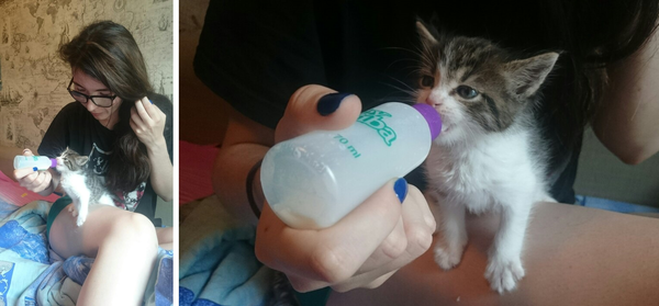 Накормили теплым молоком, сам лакать он еще не умеет, но кое-как справился. Завернули в теплое полотенце, котенок впервые успокоился. На следующий день купили для него кошачью соску и вопрос с обедом был закрыт.