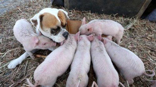 Собака стала заботиться и кормить 8 осиротевших поросят