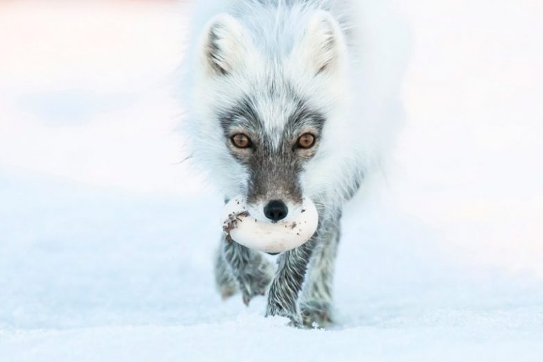 5. Песец с яйцом белого гуся во рту. Времена года на острове Врангеля очень отличаются друг от друга, что и отразилось на внешнем виде песца, которого в июне застали в середине линьки – при переходе от зимней к летней шубе.