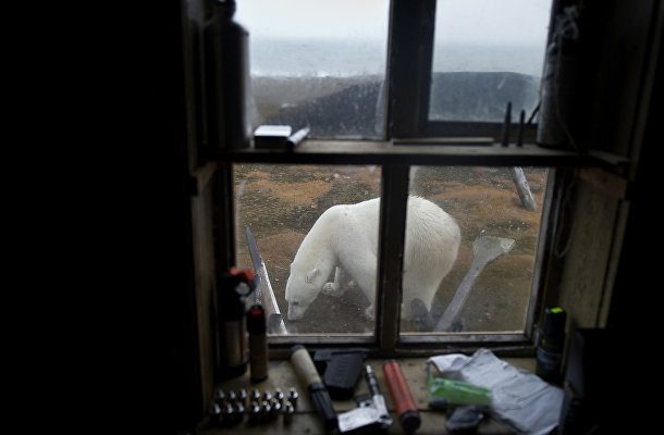 11. Полярный медведь виден из окна одной из немногочисленных построек на острове. С ростом присутствия человека на острове Врангеля растут и опасения, что между людьми и медведями могут возникать конфликты.