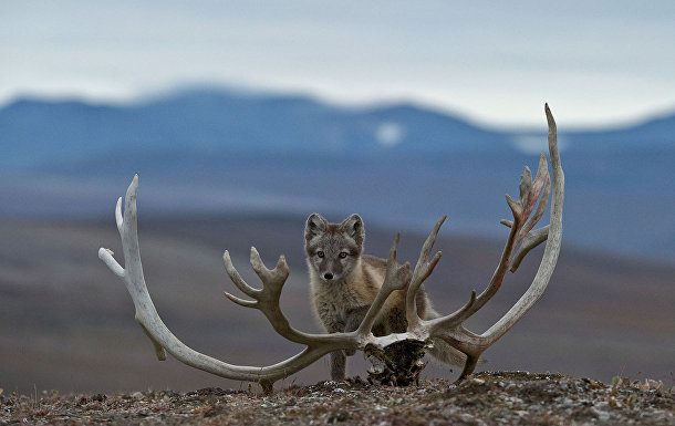 1. Полярная лисица, или песец, (Vulpes lagopus) стоит рядом с частью черепа северного оленя на острове Врангеля на российском Дальнем Востоке.