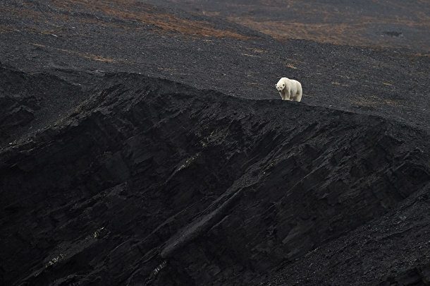 3. Белая шуба полярного медведя (Ursus marinus) контрастирует с голой черной землей на скалах.