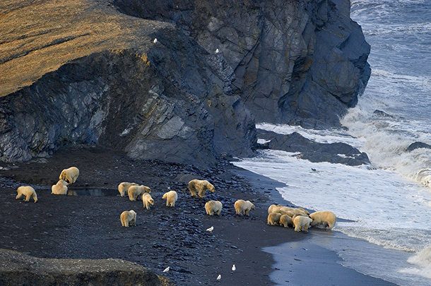 10. Группа полярных медведей столпилась на пляже вокруг туши. В отсутствие морского льда, необходимого для охоты на тюленей, медведям приходится подчищать туши на суше.