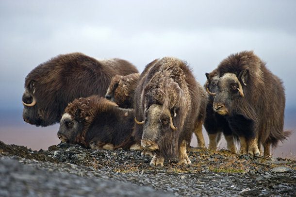 7. Стадо овцебыков, или мускусных быков (Ovibos moschatus), пересекает остров Врангеля. Популяция из 20 овцебыков была привезена сюда из Канады в 1975 году. Палеонтологические данные свидетельствуют, что эти животные жили на острове в позднем плейстоцене.