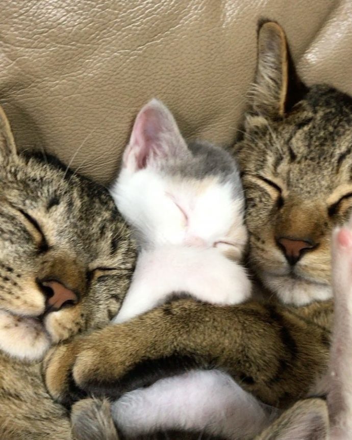 Коты породы табби по кличке Ито и Пан взяли крошек под свою личную опеку. Они начали ухаживать за ними, как за родными детьми! Ежедневные объятия стали закономерностью и скоро вошли в привычку.