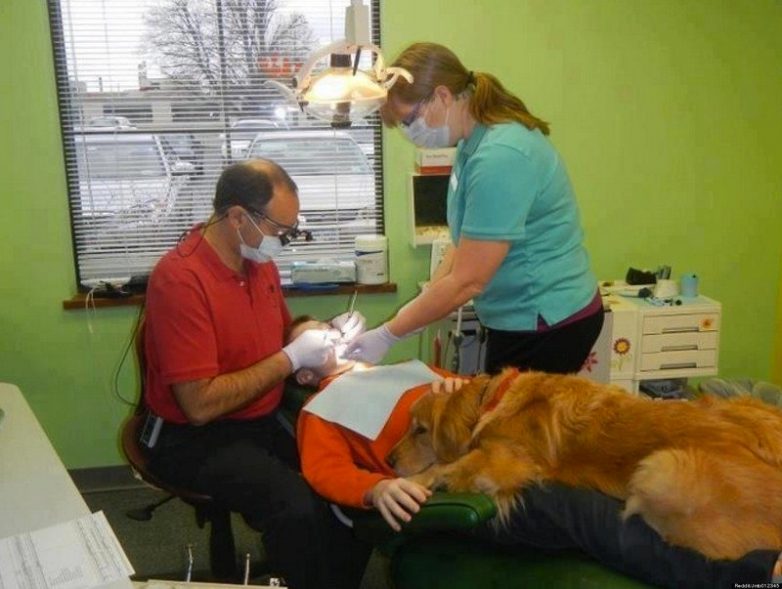 Золотистый ретривер по кличке Брук помогает детям справиться со страхом на приеме у стоматолога.