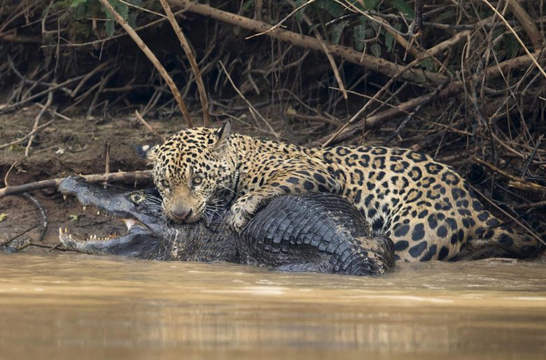Битва титанов. Еще одна эпичная схватка, которая редко попадает в кадр камеры. Ягуар против крокодила. Точнее, против каймана.