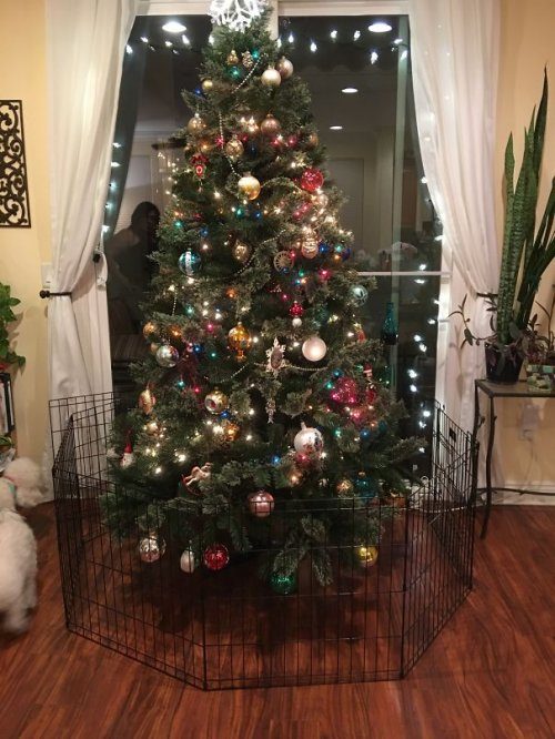 Чтобы не услышать звука разбившегося шара или падающей ёлки, многие владельцы домашних животных стараются сделать всё, чтобы отбить у питомцев желание к ней приближаться или просто сделать это невозможным.