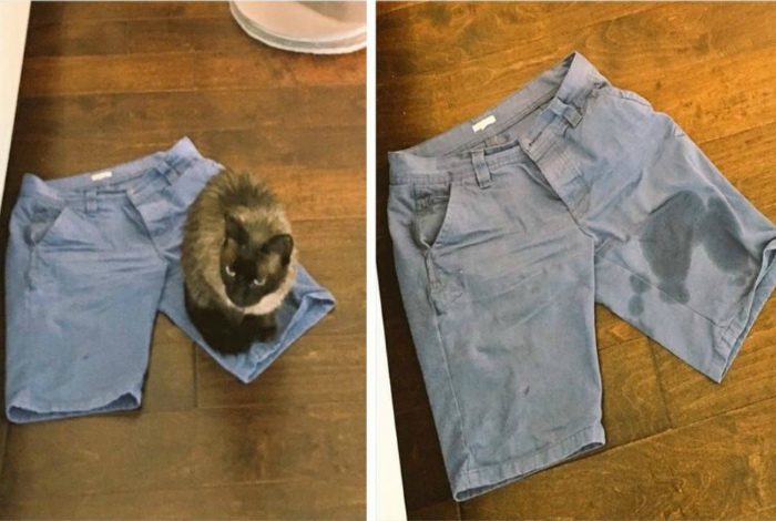 Моя кошка, царство ей Небесное, очень любила спать на моих брюках, особенно выглаженных и лежащих ещё на столе и когда и шёл по улице то мелкие псюшки заходились истеричным лаем улавливая запах кошки!