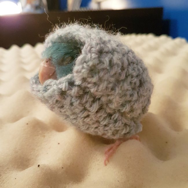 Птенец радуется тому, насколько тепло ему в новом «свитере»