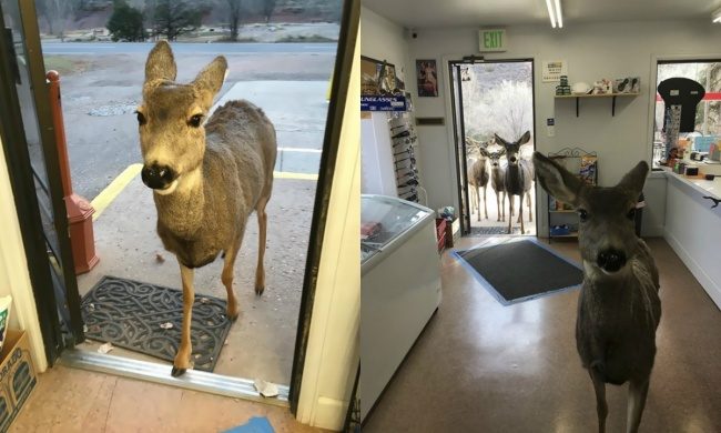 Мужчина накормил оленя, который забрел в его магазин, а после — и всю его семью, которую он привел туда же