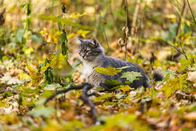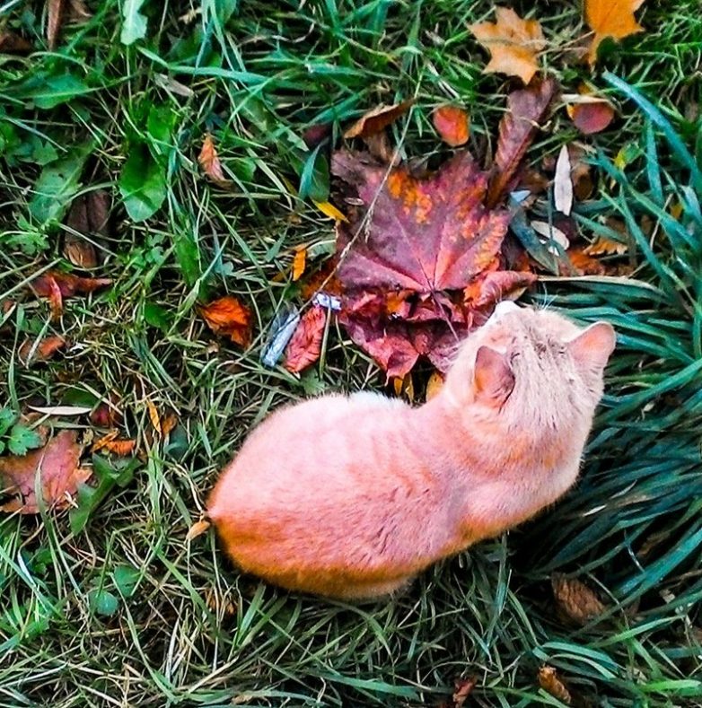 Кот замер посреди листвы и ни на какое «кыс-кыс» не реагировал, уставившись в одну точку, на все мои усилия слегка отмахивался ухом.