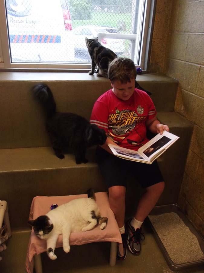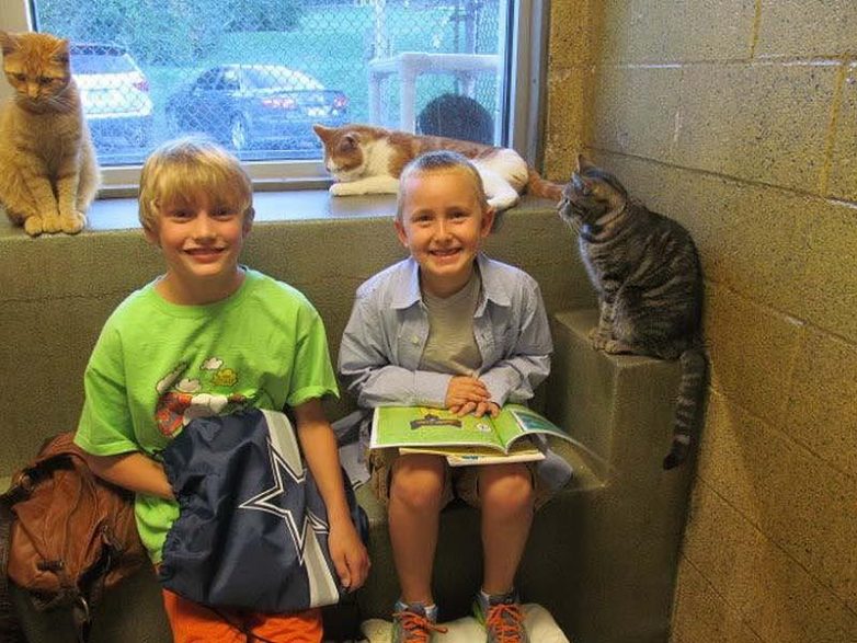 В службе спасения животных округа Беркс есть программа под названием «Книжные друзья», в которой дети с первого по восьмой класс приходят в приют и читают книжки… кошкам. Мальчики и девочки заходят в комнату, где им можно играть с очаровательными кошками и котами, в то же время читая любимые книжки. По этим фотографиям становится ясно, что и дети, и кошки получают удовольствие от совместного времяпрепровождения.