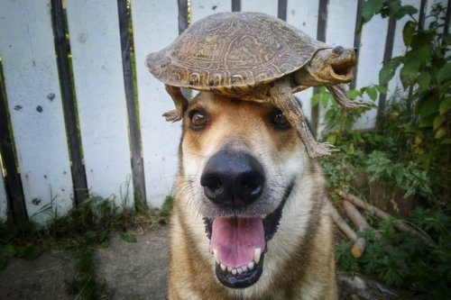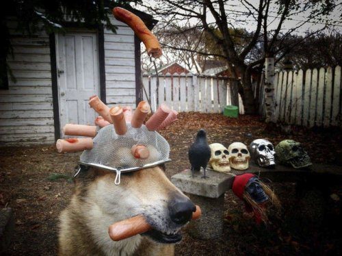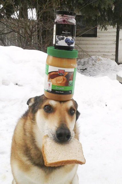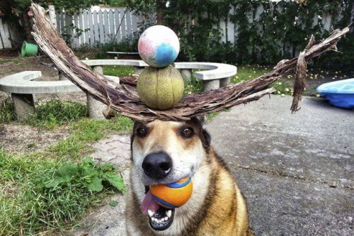 11-летний Тоби (Toby), смесь немецкой овчарки и хаски, умеет удерживать на голове практически всё, что его хозяин, Пэт Лангнер (Pat Langner), на неё положит.