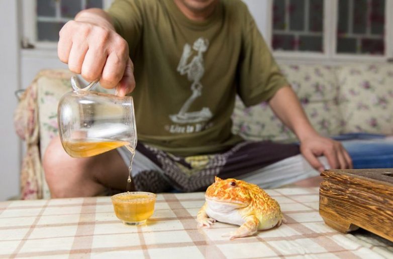 53-летний Лю Фэн с питомцем своего сына — чакской рогаткой. Вид обитает в Бразилии, Аргентине, Боливии и Парагвае. Лягушка на фото — одна из 30, живущих в маленькой квартирке Лю Фэна и его сына в центре Пекина