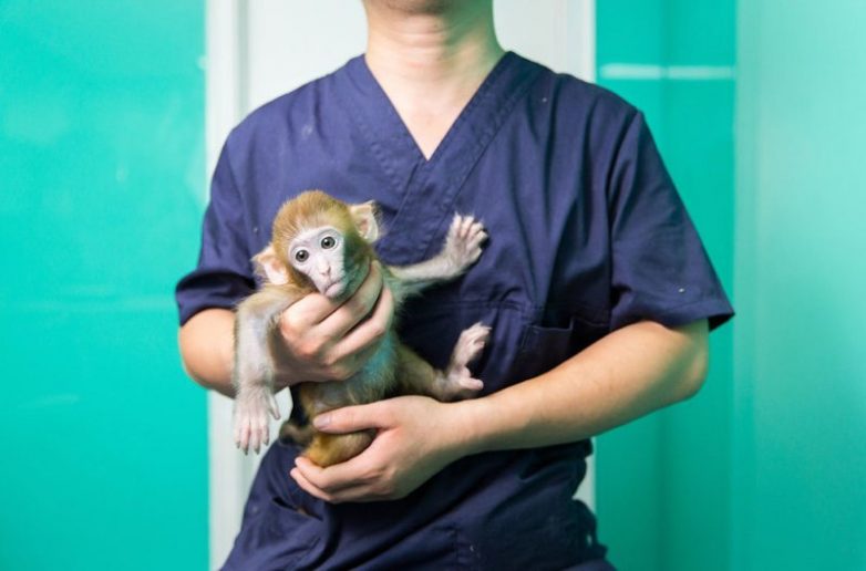 Макак-резус на руках ветеринара в пекинском магазине