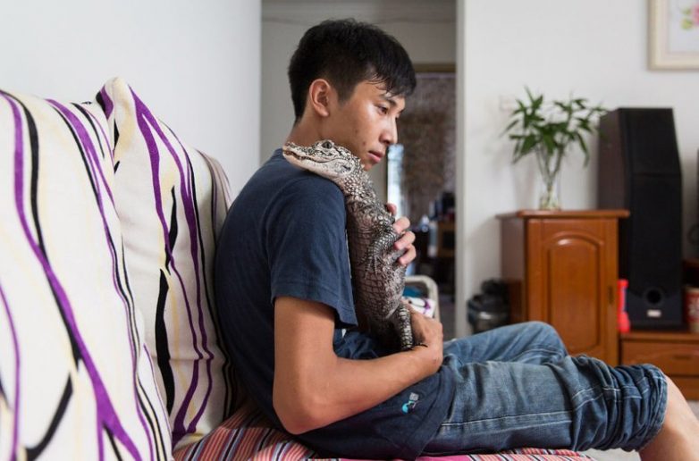 26-летний Шао Цзянь Фэн с аллигатором Янцзы в своем доме на окраине Пекина. Этот вид аллигаторов находится под угрозой исчезновения из-за браконьерства и рекультивации водно-болотистых угодий и внесен в Красную книгу