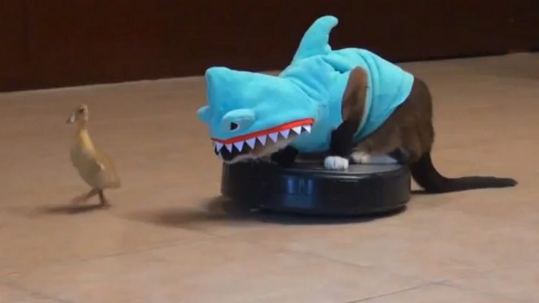 27. Укротит робот-пылесос, нарядившись в костюм акулы (все коты делают это!).