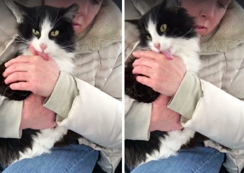 Как только бедняжку покормила Дженнифер – одна из команды спасателей, питомица начала мурлыкать и облизывать ее руки в знак благодарности.)