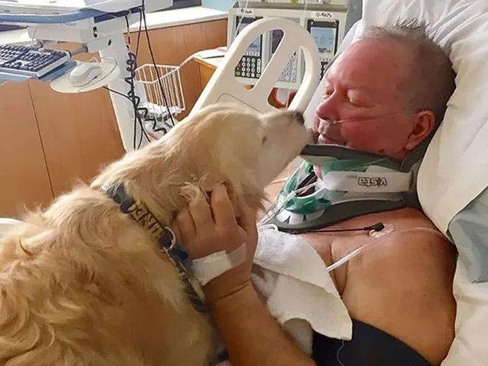Мужчина, сломавший шею на морозе и пролежавший в снегу почти 24 часа, остался жив благодаря своей собаке, которая лежала на нём и неустанно лаяла зовя на помощь. Мужчина был одет в легкое трико, футболку и тапочки, потому что выходя в -4 °C он не планировал находиться на улице долго. Он поскользнулся, упал и сломал себе шею. 5-летний золотой ретривер по кличке Келси лег на мужчину пытаясь согреть хозяина, и всё время облизывал его лицо и руки не давая ему уснуть.
