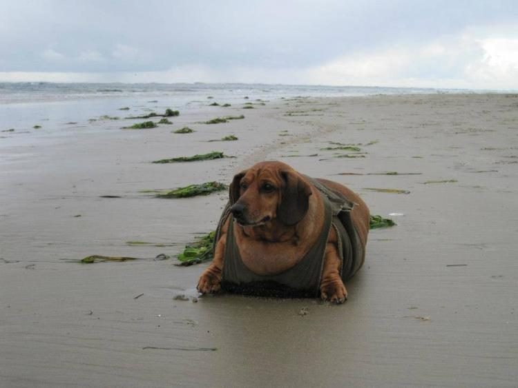 Вот это вот гротескный мешок мяса и сала – такса по кличке Оби, какой она была на тот момент, когда ею заинтересовались зоозащитники. При норме для породы в 15 кг максимум для взрослой особи, Оби весила более 35 кг! Её пузо буквально волочилось по земле и в последствии пришлось соорудить специальный бандаж, чтобы собачка не повредила спину при похудении.