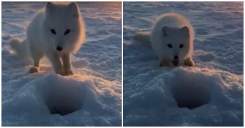 К рыбачившему жителю Норильска наведался голодный песец и подкравшись к лунке, в которой лежала мойва, попытался ее стащить. Мужчина отчитал зверя за наглость, но в конечном итоге позволил ему полакомиться свежей рыбкой.