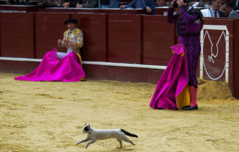 Кошка появляется во время боя быков в Боготе, Колумбия, 28 января 2018.