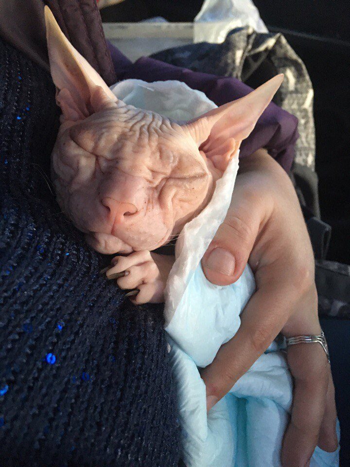 «Несчастная кошка вот так ехала всю дорогу: прижавшись ко мне и боясь открыть глаза. В один момент у неё из глаз покатились слезы!