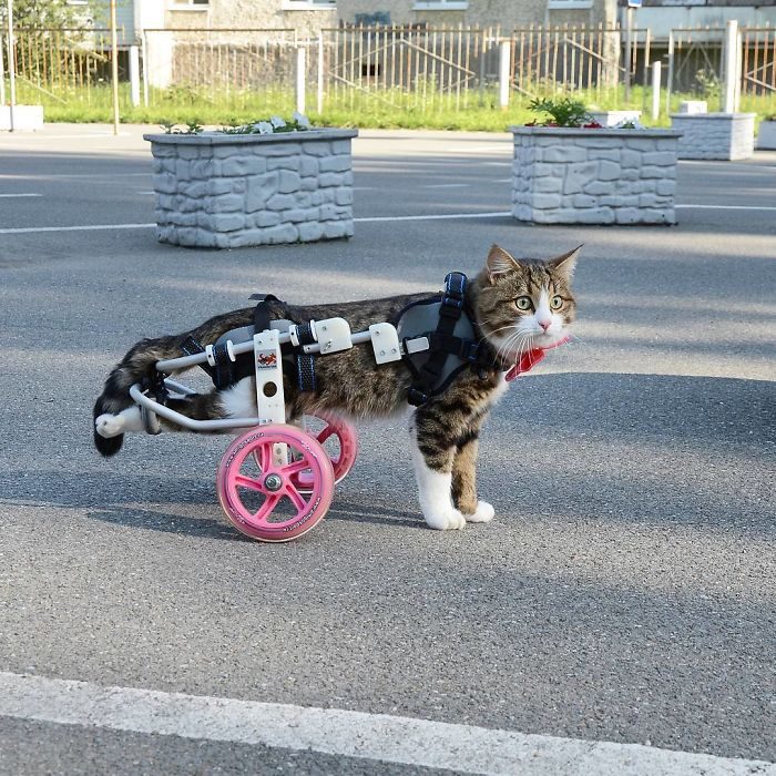 Сначала, чтобы помочь существу обойти дом, Минаева усадила кота в своеобразное кресло-коляску. Но вскоре оказалось, что эта затея малоэффективна. «Он справляется гораздо лучше и без неё. Кошки очень независимы и прекрасно могут приспосабливаться. Рекси более мобилен, при этом ему намного более удобно, когда он ходит и бегает опираясь только на две свои лапы.»