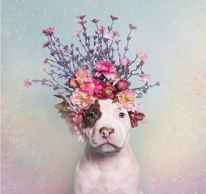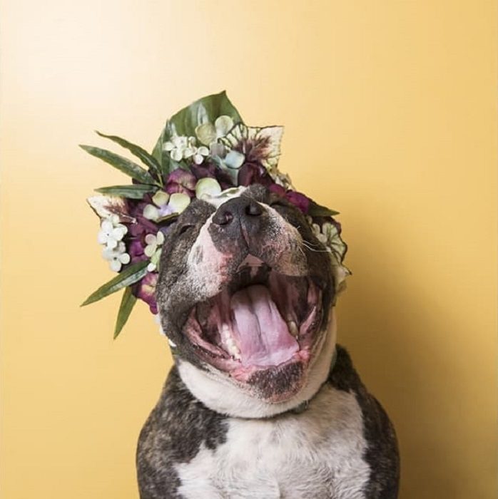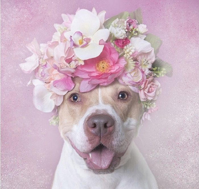 Питбуль в нежном цветочном украшении.