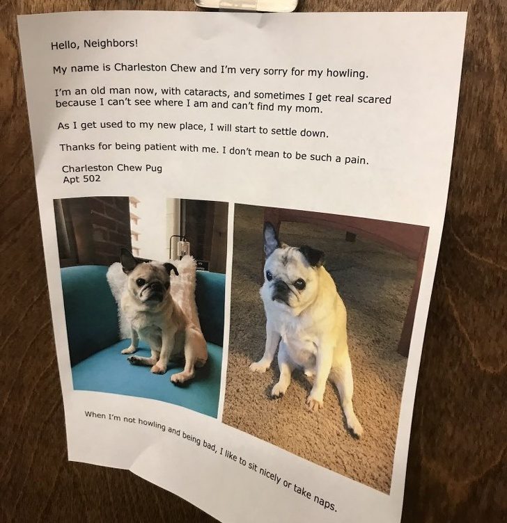 «Привет, соседи! Меня зовут Чарльстон Чу, и мне очень жаль, что я вою. Я старичок, у меня катаракта, и иногда мне очень страшно, потому что я не вижу, где нахожусь и где моя мама. Когда я привыкну к новому месту, я успокоюсь. Спасибо за ваше терпение. Я не хотел быть таким наказанием для вас.