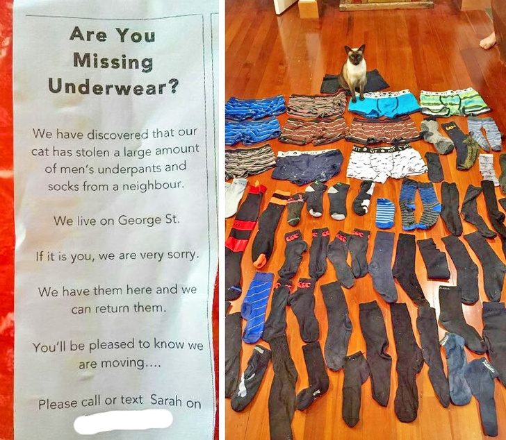 Мы обнаружили, что наша кошка украла целую кучу мужских трусов и носков. Мы живем на Джордж-стрит. Если у вас что-то стащили, нам очень жаль. Мы сохранили все вещи и можем их вернуть. Вы обрадуетесь новости о том, что мы переезжаем.