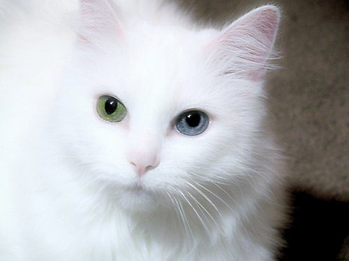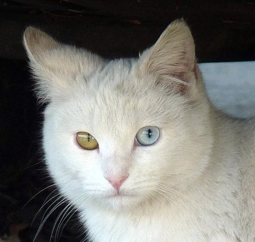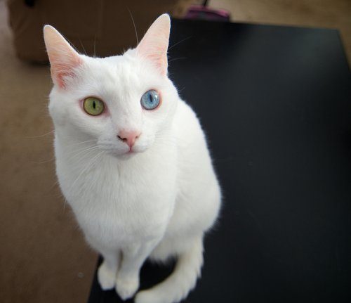 Полная гетерохромия часто встречается у таких животных, как кошки и собаки. Пораженный глаз почти всегда становится голубым. Это происходит в областях белого цвета, где меланина нет – похоже, что больше всего данному состоянию подвержены кошки породы Турецкий Ван и Ангорская. Кошки с разными глазами обычно имеют белую шерсть, один глаз у них обычный, а второй голубой, что делает их внешность очень яркой.