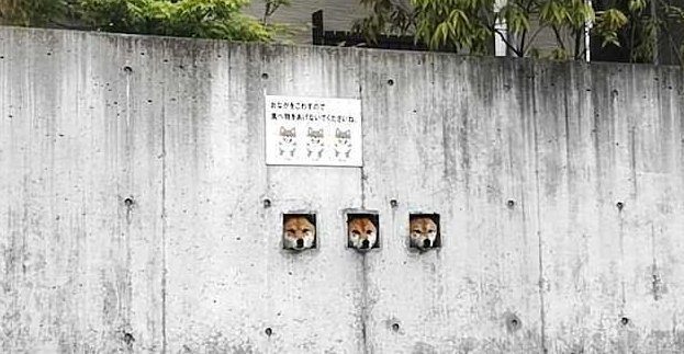 По словам блогера, собаки не всегда дежурят в отверстиях, но стоит их позвать, и они тут же появляются. Видимо, из-за общительности собак их хозяин и повесил над их отверстиями табличку, на которой по-японски написано: «Пожалуйста, не кромите собак, от этого у них понос».