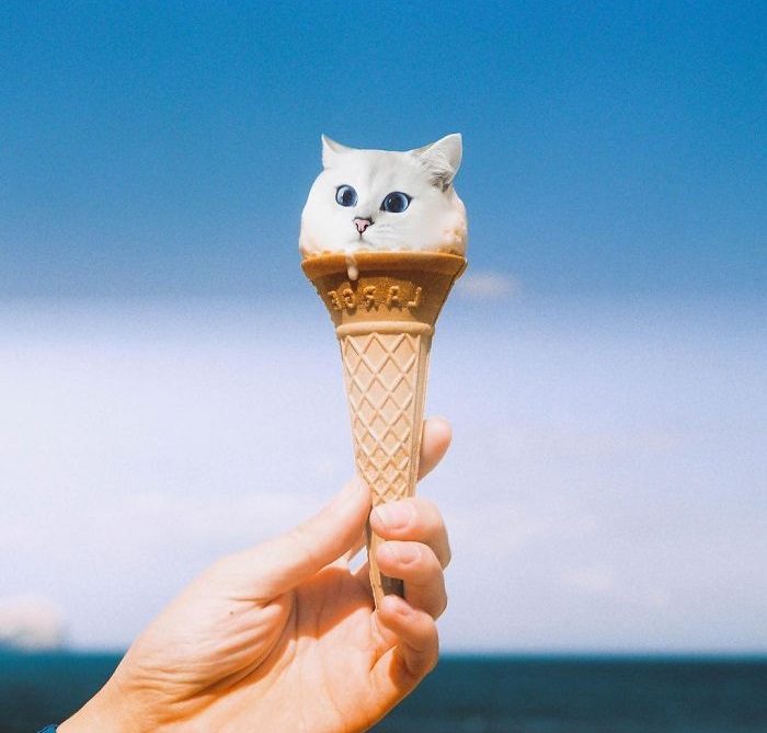Двухцветный кот с добрыми глазами на вершине мороженого.