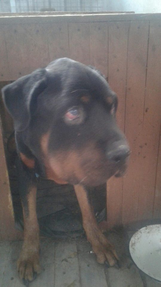 Жестокие хозяева обрекли пса на ужасную и долгую смерть. Собака была без еды и без воды около месяца. Бедный, измученный ротвейлер сильно похудел, у него были отеки на голове и шее. Из-за обезвоживания он потерял зрение.