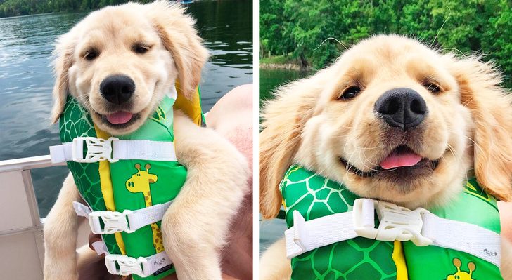 «Это Тед. Сегодня он отправился в свое первое путешествие на лодке. Как вам его спасательный жилет с жирафом?»