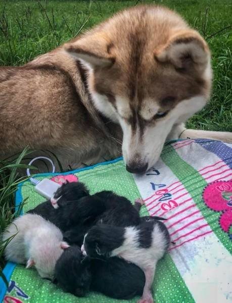 Хаски, которая стала мамой для котят