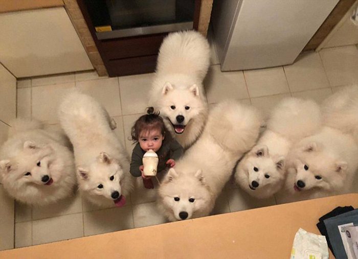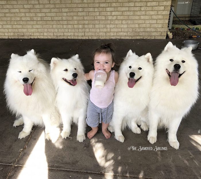 Сара рассказывает, что она взяла себе первых щенков самоедов всего за 4 месяца до рождения Лейлы, так что они расли буквально вместе. «Лейла научилась ходить в помощью щенков, следуя за ними по всему дому. Она часто делится с ними едой, они вместе спят, вместе читают, все делают вместе. Шиммер и Лейла часто вместе играют дома и во дворе с общими игрушками. А если Лейла плачет, собаки приносят ей свои игрушки. И сейчас, когда Руби маленькая, собаки также пытаются утешить и ее тоже.»