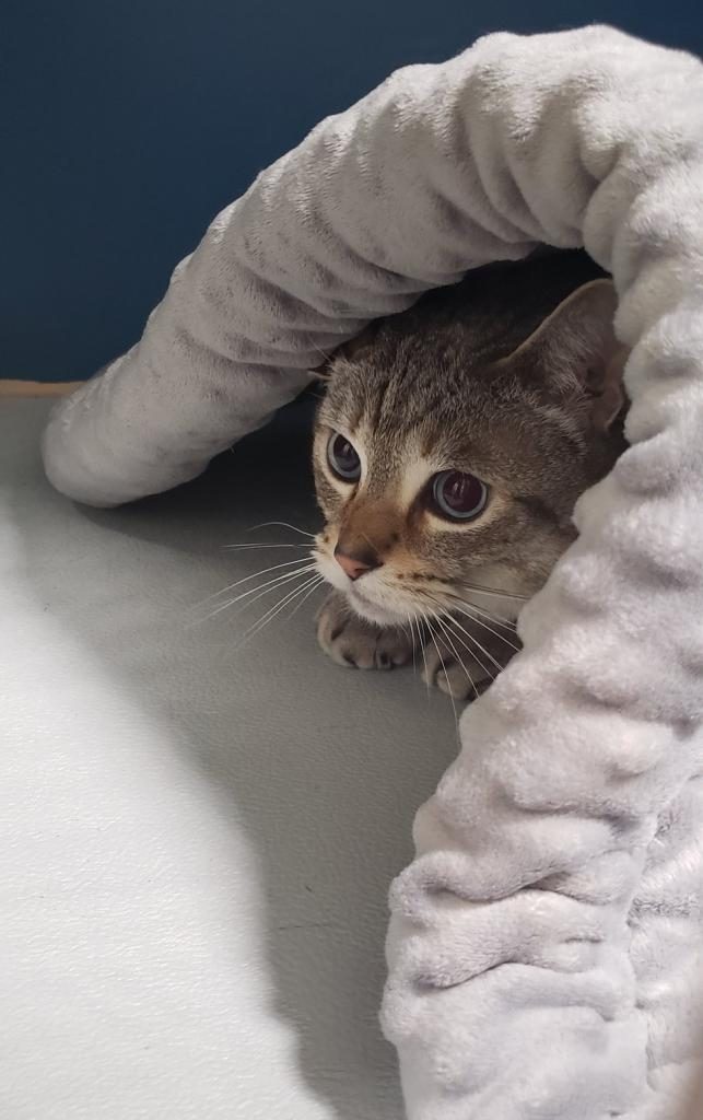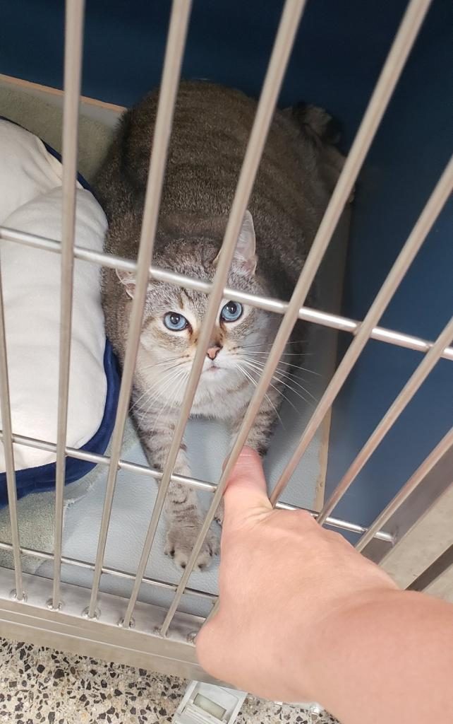 Кот весом в 12 кг и глазами перепуганного котенка, который искренне обрадовался, когда ему дали одеяло. Спрятался под него и боялся даже взглянуть наружу.