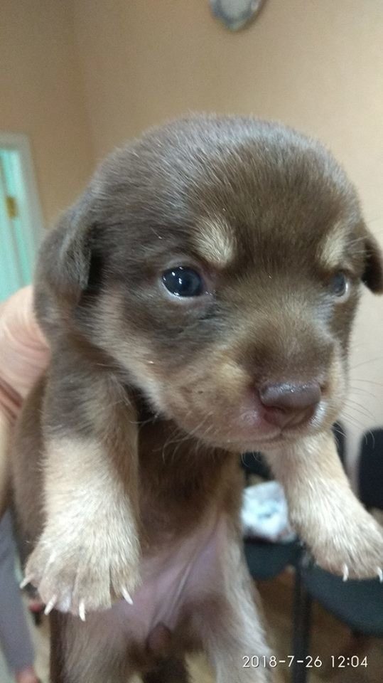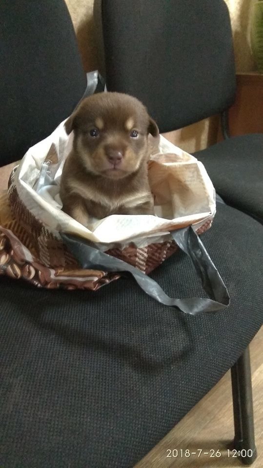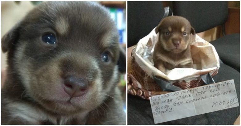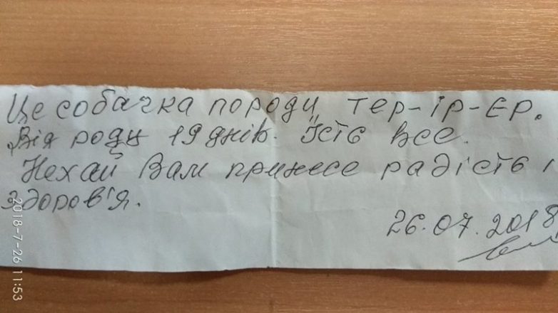 «Це собачка породи тер-ір-єр. Від роду 19 днів. Їсть все. Нехай Вам принесе радість і здоров’я. 26.07.2018. Підпис».