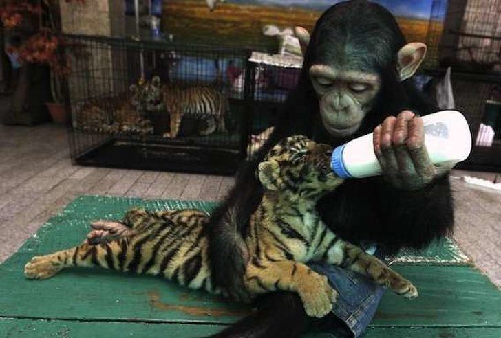 Шимпанзе заботится о крошечном тигренке не хуже родной матери